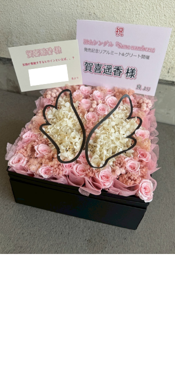 淡いピンクのバラで彩られたフラワーボックスは、可憐さと上品さを兼ね備えた特別な仕上がりです。中央には純白の花でかたどられた「翼」が添えられ、羽ばたくように未来へ進む姿を表現。シンプルながらも洗練された黒のボックスが全体を引き締め、甘さと気品を両立させています。アーティストの新たな門出を祝福し、温かな想いをダイレクトに伝えるデザインです。