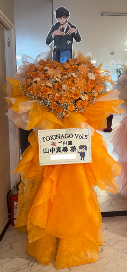 温かみのあるオレンジの花々でまとめられたフラスタは、会場を一気に明るく華やかに彩ります。上部にはキャラクターの等身パネルが添えられ、推しへの愛と応援の気持ちがひと目で伝わるデザインに。ボリューム感あるラッピングも存在感抜群で、特別な舞台をより一層盛り上げてくれる仕上がりです。