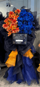 温かみのあるオレンジの花々でまとめられたフラスタは、会場を一気に明るく華やかに彩ります。上部にはキャラクターの等身パネルが添えられ、推しへの愛と応援の気持ちがひと目で伝わるデザインに。ボリューム感あるラッピングも存在感抜群で、特別な舞台をより一層盛り上げてくれる仕上がりです。